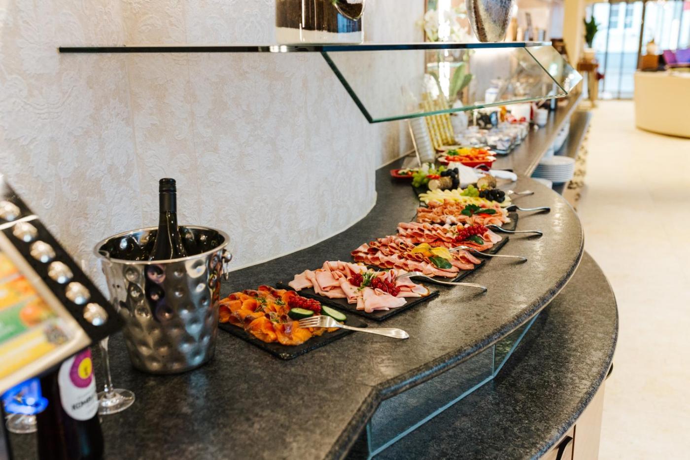 Buffet and continental breakfast options with warm dishes, fresh pastries and champagne are available.